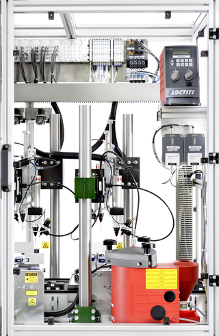 Prensa-inserción de un rodillo guía y la inserción de un downholder para la correa de transmisión, así como la aplicación de adhesivo y activador en dos áreas de engranajes. Esta estación de encolado forma parte de un sistema de ensamblaje, donde todas las estaciones están conectadas a través de un sistema de transferencia. La comunicación del sistema de transferencia es manejada por un sistema de lectura y escritura. El sistema de lectura y escritura asegura que cada proceso incluye los pasos operativos necesarios y lo confirma en la siguiente estación.