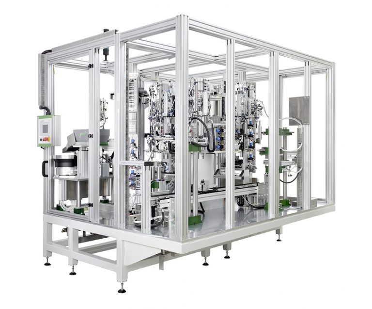 Este sistema de ensamblaje incorporó dos Alimentadores vibratorios del programa estándar DEPRAG, que están equipados con un sistema de cámara de supervisión parcial (reconoce la rosca izquierda o derecha del transportador) que verifica la clasificación precisa de la posición. Dos las tolvas accionadas por correa con una capacidad de 10 litros cada una garantizan el aprovisionamiento óptimo de las piezas.