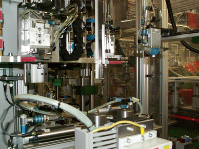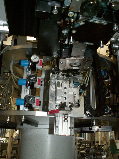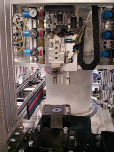 Estación automática para el entallado y la inserción de la prensa del adaptador durante el montaje del motor del cepillo eléctrico del aspirador y el reductor. Esta estación es parte de una línea de montaje completa, donde todas las estaciones individuales están conectadas por un sistema de transferencia. La comunicación del sistema de transferencia es manejada por un sistema de lectura y escritura. El sistema de lectura y escritura asegura que cada proceso incluye los pasos operativos necesarios y lo confirma en la siguiente estación.
