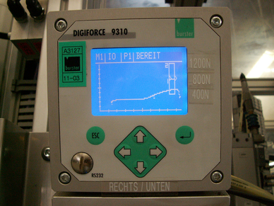 El proceso de enrollado del pestillo en el eje se verifica mediante un sistema de medición de fuerza / distancia (Digiforce 9310) y la curva se muestra gráficamente.