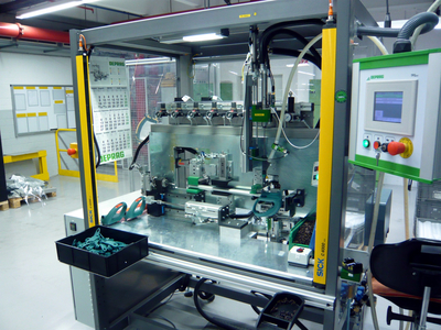 Montaje del gancho de cable al mango del aspirador y diferentes pruebas de funcionalidad del mango del aspirador. Si una prueba no es correcta, la máquina no liberará la pieza defectuosa para el siguiente proceso.