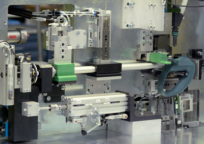 El gancho de cable premontado debe fijarse al mango. Los tornillos necesarios se suministran automáticamente mediante un alimentador vibratorio y se aprietan con un husillo de destornillador en línea MINIMAT-C. El control de profundidad integrado verifica la profundidad correcta del tornillo. Al mismo tiempo, una prueba de tracción establece si el tubo del mango está bien sujeto y si la empuñadura está asentada positivamente.