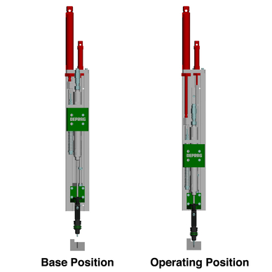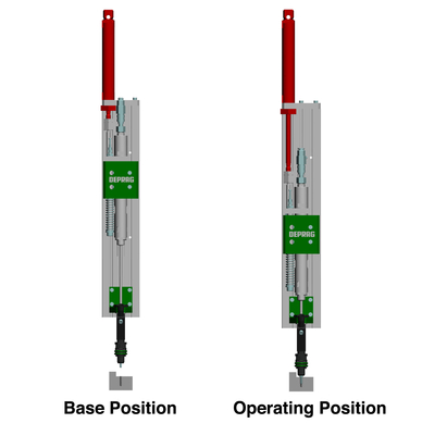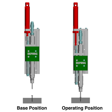 Para ensamblajes verticales e invertidos, un posible peligro es que el tornillo alimentado en la boquilla (manga guía) caiga de nuevo en las herramientas debido a la gravedad. Para esos tipos de aplicaciones equipamos el módulo de función de atornillador con un cilindro de accionamiento adicional: Además de los trazos para la boquilla y el husillo, y se aplica una carrera de bloqueo adicional a la broca colocada hacia adelante para evitar la caída trasera del tornillo. En comparación con otros sistemas ofrecidos, donde el tornillo se mantiene en posición por una presión de aire continua, nuestra tecnología de bloqueo-carrera es especialmente confiable y eficiente en el proceso.