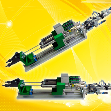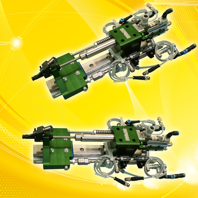 Para esta aplicación, el módulo de funciones de atornillador es estructuralmente la integración en su sistema. La boquilla y la boquilla tienen que moverse en la parte superior de la ubicación del tornillo. Por lo tanto, el módulo de función del atornillador está equipado con dos cilindros de accionamiento; uno para la boquilla-carrera y otro para el husillo-carrera.