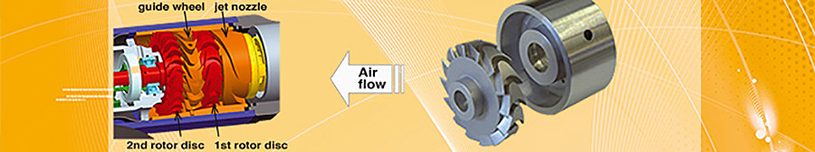 La conversión de la energía de presión en energía cinética tiene lugar en la boquilla de entrada. En una turbina de dos etapas, la mayor parte de la energía cinética se convierte en la primera rueda de turbina. El flujo de aire se desvía sobre la rueda estacionaria de la turbina. La energía restante se convierte en la segunda rueda de turbina.