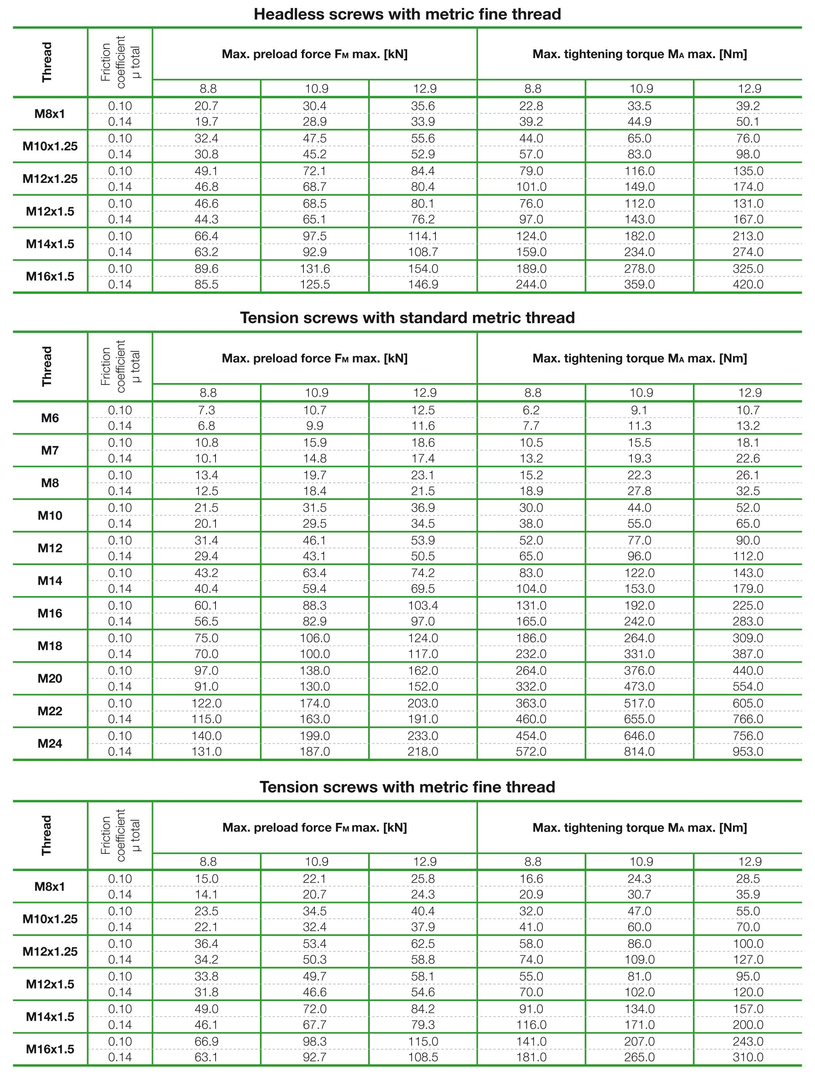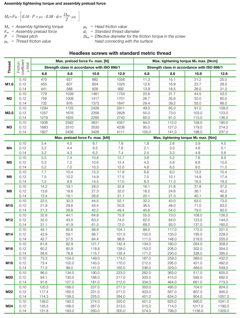 Además, se pueden determinar experimentalmente otros parámetros como el ángulo, el tiempo de atornillado, la fricción, etc., que sirven como dimensiones guía para el proceso de montaje. Los valores de referencia nos proporcionan tablas como se muestra a continuación.