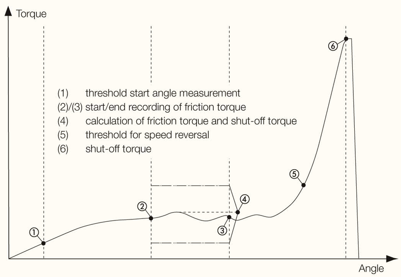 Dentro de un rango de ángulo ajustable durante el proceso de rodadura del tornillo, se registran los límites de par superior e inferior requeridos para los procesos de conformado de rosca o corte de rosca y se calcula un valor promedio (= el valor de torque de fricción). Este valor de torque de fricción determina (a través de un valor de torque umbral) un factor de apriete adicional requerido o «torque de diferencia». La suma del torque de fricción y el torque de diferencia se suma al torque óptimo de asiento del tornillo.