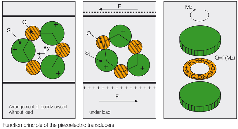 Durante el procedimiento de medición piezoeléctrico los cristales de silicio se deforman elásticamente, de modo que aparece una carga eléctrica en sus superficies exteriores definidas. Esta carga se encuentra para ser proporcional a la fuerza aplicada.